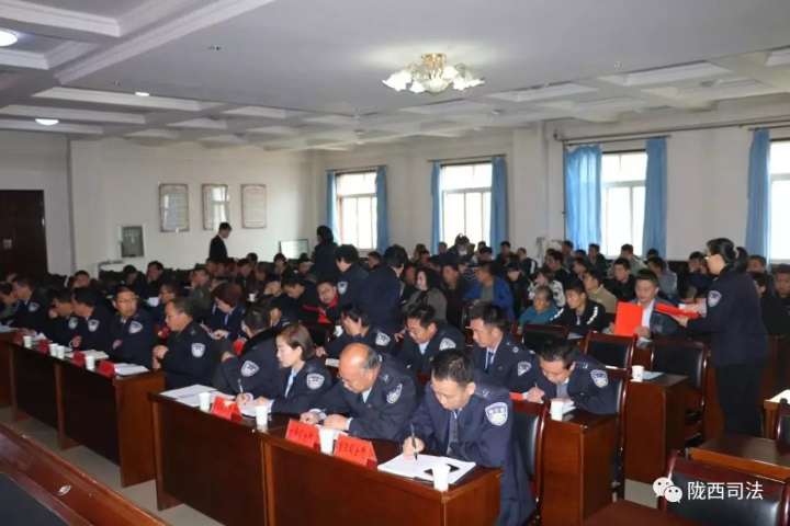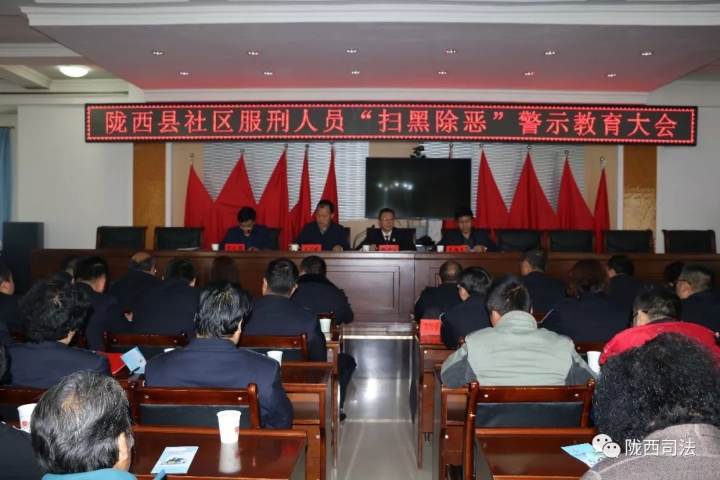 为深入推进刑罚执行一体化建设,切实加强对社区服刑人员的教育监管, 11月1日上午,陇西县司法局组织召开全县社区服刑人员扫黑除恶专项斗争警示教育大会,驻各乡镇检察室主任、各司法所所长、县司法局相关股室工作人员以及全县103名社区服刑人员参加了会议。