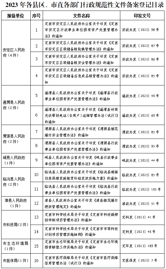 2023年各县区、市直各部门行政规范性文件备案登记目录